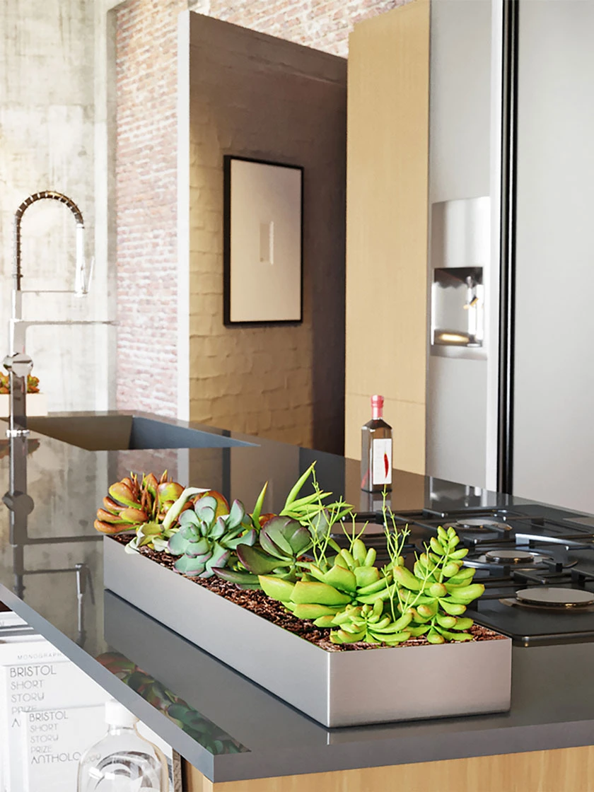 Low and sleek, the Geo Trough planter is the perfect addition to any table top, window sill or fireplace mantle. Crafted from a thick gauge, fully seam welded stainless steel base, the Geo planter is extremely versatile providing a unique look as kitchen accent or as a table top focal point. Whether planted with succulents, moss or even used as a vessel for candles, fruit or nuts, the Geo planter provides a sleek, modern look in all settings. All Geo Series planters are fully seam welded to prevent leakage. With a Veradek product you can rest assured that you are receiving the perfect balance of design, durability and convenience.